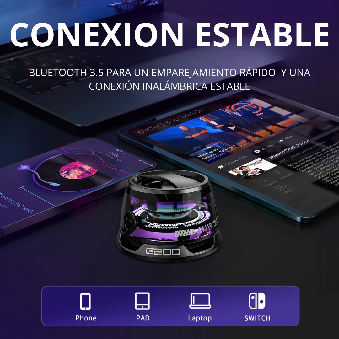 Presentamos el Altavoz G200, un dispositivo diseñado para quienes quieren llevar su música a otro nivel, sin cables, sin instalaciones y sin complicaciones.